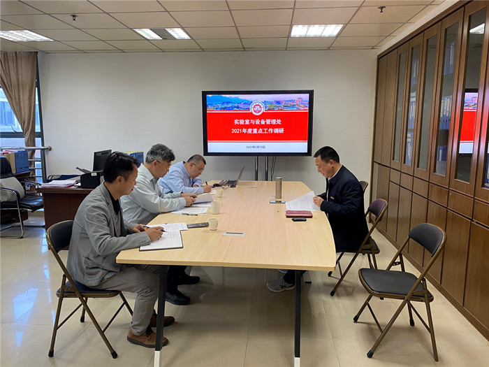 315日,副校长涂荣到实验室与设备管理处(实验室危险化学品管理中心)调研指导2021年重点工作实施情况,与处班子成员集体谈心谈话,贯彻落实学校党委开展“再学习、再调研、再落实”活动的部署要求。