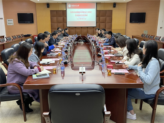 近日,西南大学学生工作部(处)部(处)长孙楚航一行11人来玩球(中国学生工作部(处)调研交流。学生工作部(处)陈祖棋、汪启思、部分学院副书记以及相关科室人员参加了座谈会。会上,陈祖棋介绍了玩球(中国的基本情况以及学生工作的相关做法及工作成效。双方就辅导员队伍建设、学生工作品牌建设、学生管理等方面进行了深入交流和讨论,相互借鉴彼此的经验与做法,希望今后能进一步加强交流。[学生工作部(处)]