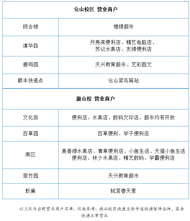 商户营业、快递如常。为保障学生生活必需品充分供应、学生上网课时设备故障能及时维修,校内商超、水果店、数码店、便利店正常营业。